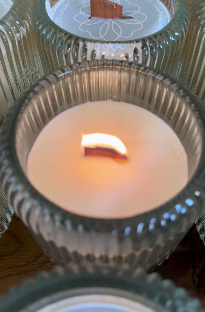Vela aromática artesanal en frasco de vidrio estriado y pabilo de madera.